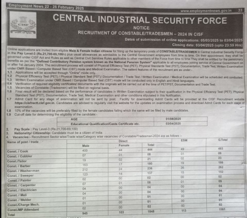 | Post Name | CISF Constable Tradesmen Vacancy 2025: Apply for 1161 Posts | |